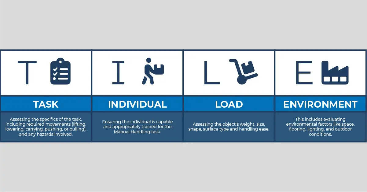 Learn what TILE stands for in manual handling and how Task, Individual, Load and Environment assessments prevent workplace injuries. Clear examples, hazards and safety tips included.